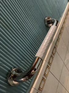 前回浴槽近くにひとつ手すりを付けたのですが、今回は出入口のちかくにもうひとつ。持参したドライバー付属のものでタイルが削れなかったので少し高めの位置に設置。ねじ+接着剤で固まるかどうか様子見。。この取り付けに思ったより時間がかかりました。夫、がんばった。