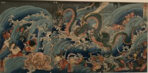 絵の左下に描かれているのが玉取姫ですね。襲い掛かる龍+海の民のユーモラス、いや勇猛なこと。
