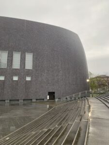 中ホール。木とガラスの美しいつくり。温かい。会場の後ろ(上)にもゆったりとした広いスペースがあって、椅子もたくさんあり天井が高くて落ち着く空間でした。何時間でも居れそう。