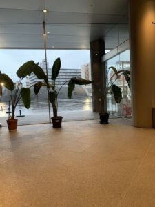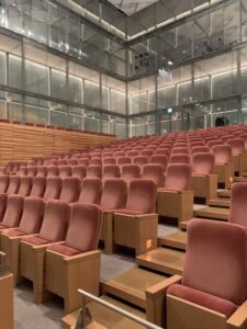 中ホール。木とガラスの美しいつくり。温かい。会場の後ろ(上)にもゆったりとした広いスペースがあって、椅子もたくさんあり天井が高くて落ち着く空間でした。何時間でも居れそう。