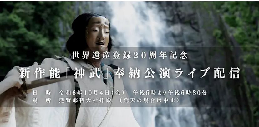 記念イベントのひとつとして、那智大社での新作能「神武」が10月4日に奉納されました。そしてその模様を公式YouTubeチャンネルでライブ配信していただけるというお知らせをX(那智大社フォローしてますので)で見つけて、17時からお茶の間スタンバイ。