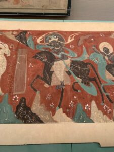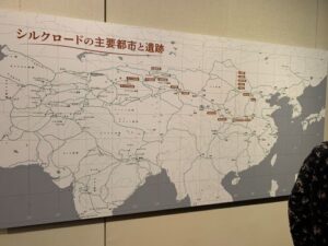 入って少しいくと、シルクロードを示す大きな地図。それぞれの遺跡の位置も書いてあります。展示の品にもひとつひとつ出土された遺跡名があって、「ウィグル自治区xx」がいくつも。山岳地帯や砂漠で培われた歴史の流れ、風景のパネルも多く展示されていて、一気にその世界へいざなわれます。