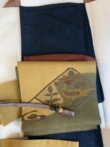当初の予定は単衣+名古屋帯。秋の色…でも背もたれできないとしんどいし、皺がよるのいやだなと急遽半幅帯に変更したのでした。