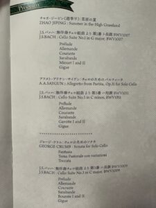 冒頭、馬頭琴を思わせる「草原の夏」からバッハ無伴奏の第1。チェロのためのパルティータをはさみ流れるように無伴奏の第5。まるでさっきからそこにいて、さっきからずっと演奏していた?くらいにすべりこんでくる音。。ずっとどこか空をみて楽し気に時に物憂げに演奏する氏のさまは、至高の領域に住むお方そのもの。演奏後に静まり返って時がとまったかのような、息をのむ時間もありました。圧巻とはこのことです。