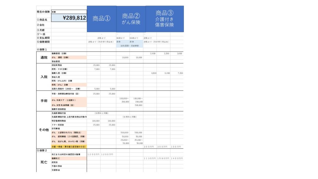 左端に上から ①商品名 ②扱っている会社 ③月額支払い(③’一括支払いあれば)④払込期間 ⑤保障期間とカテゴリ(通院、入院、死亡保障)の種類を書いていきます。掛け金は社内価格もあるのでマスクさせていただきますね。