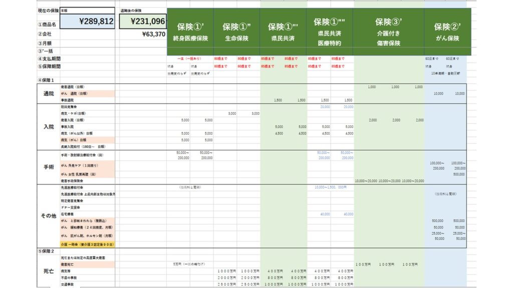 左端に上から ①商品名 ②扱っている会社 ③月額支払い(③’一括支払いあれば)④払込期間 ⑤保障期間とカテゴリ(通院、入院、死亡保障)の種類を書いていきます。掛け金は社内価格もあるのでマスクさせていただきますね。