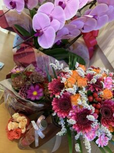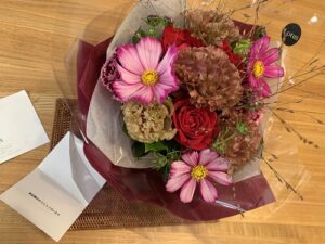 メッセージカード、手作りのハーバリウム、花束、名前入りタンブラー、ボディソープ、入浴剤、バスソルト、ガーデニングエプロン、コーヒー、ギフトカードなどなど。こちらも温かいお心遣いに感謝。結婚式以来の(!)おめでとうの気持ちを頂き幸せな気持ちになりました。いい職場・ハートフルないい仲間たちでした~。