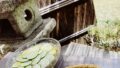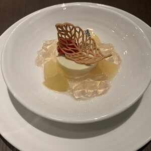 デザート。レモンバーベナのパンナコッタ 白桃のコンポート。
