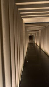 この千本鳥居をイメージした長い廊下の先にスパや温泉施設があります。予約必須のプライベート温泉=貸し切りです。