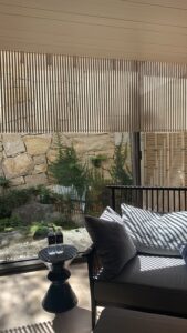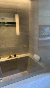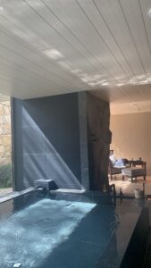 もう、お湯の加減といいお部屋といい庭といいしつらえといい…フルーツはキンキンに冷えていますしシャワー室がミニサウナみたいになっていてドリンクもたくさん冷蔵庫にあり飲み放題。写真には写っていませんが大きなテレビやアップルミュージックの選択もできます。