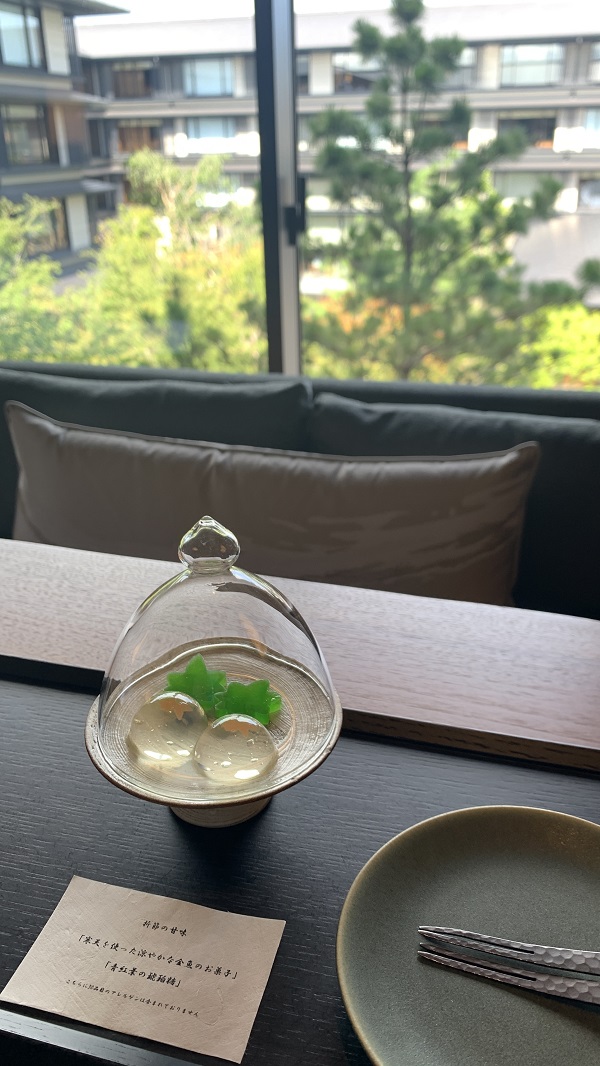 はい、ウエルカム水菓子です。涼し気なお心遣いに気持ちも和みます。
