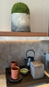 苔玉の大きさに驚きつつ、和のしつらえ。ケトルやお菓子類は引き出しに納まっていて、コンパクトに無駄のない空間です。