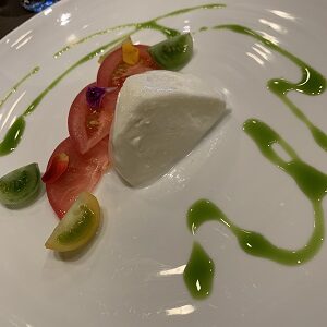 前菜。久美浜産ジャージー牛乳のモッツアレラと彩りトリコロールトマトのカプレーゼ。