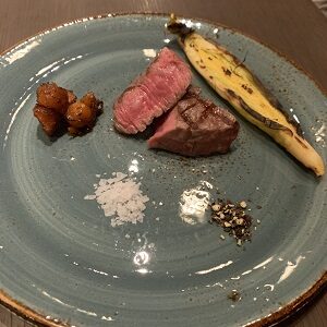 メインディッシュ。国産牛サーロインのタリアータ かぼちゃのアグロドルチェ