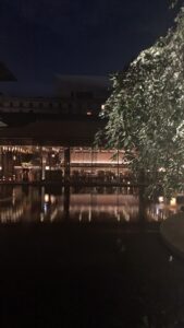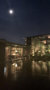 お部屋へ。月とお庭と水に映るお宿が素敵。京都の夜は更けていきます。