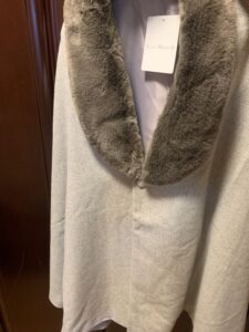 16,500円なり。うすいグレーのヘリンボーンで裏地つき。襟のフェイクファーはとりはずせます。