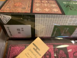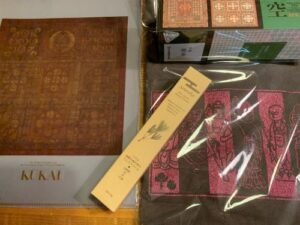 左の赤いのが曼荼羅のクリアフォルダー、細長い箱が高野槙?のハンドクリーム。その右の箱は煎茶と辻利のお菓子、空海仕様。ピンクの柄のTシャツは夏だし地下のミュージアムショップで買い足してみた。