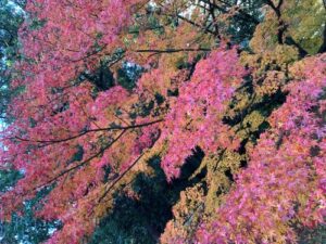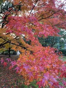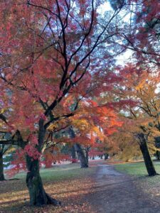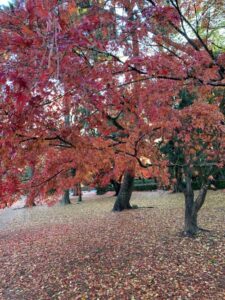 枝先も落葉も紅葉して真っ赤っか。晩秋の静かな御苑は空気が澄んでいて、清々しい時間を過ごすことができました。