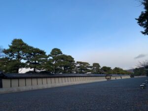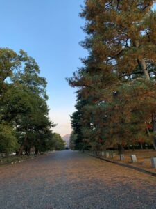 公演終了が16時だったので、日が沈む前にと、冷たい雨が小降りになったスキに京都御苑内を散策することに。アルティ向かいの中立売御門から入り南へ九条邸跡を過ぎて堺町五門まで。ひろびろした御苑の中、雨が葉を打つ音と私が砂利道を歩く音しかしない。。人はまばらにいるけれど、遠すぎて足音も話し声も聞こえない静寂の世界をしばし楽しみました。