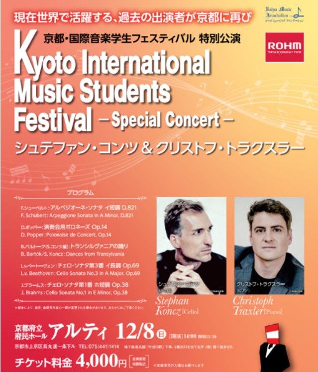 この日は京都で2ついきたいチェロコンサートがあって(そんなお贅沢なことある??)、選んだのはこちら、シュテファン・コンツ氏(チェロ)、クリストフ・トラクスラー氏(ピアノ)のコンサート。