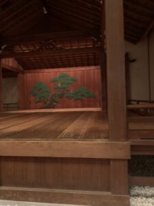 能楽の舞台にある松の絵はこの松(を向かい合わせた鏡に写し取ったテイの絵)なんです。前におわす松(神様)にむかい能楽をおさめる。