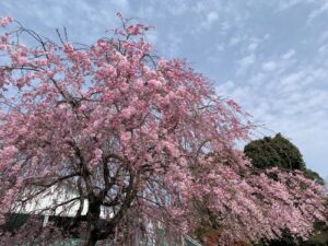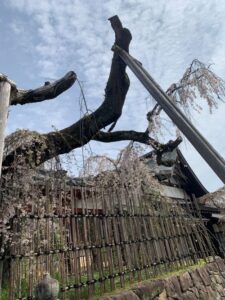 樹齢100年越えの枝垂れ桜は伐採されてもなお花を咲かせる神々しいお姿。。(観光客は素通り…)