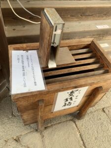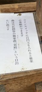 本殿前ではお賽銭を入れると雅楽が奉納できる=雅楽が境内になりひびくというアイデア賽銭箱があったのでやってみました。