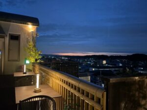 大浴場(1階)からエレベーターで屋上テラスへ。夕景もよき