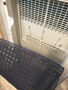 べとべとではないものの、汚れてる。。このフィルターの裏側からたまに掃除機で屋外でほこりを吸い取るというマニュアル通りのお手入れ方法でやってきたのですが、この惨状。これほんとにここ数年大丈夫やったんかな、却って空気が汚れてなかったんかなと心配になる。。まあ、、センサー=青(清浄)を信じよう。