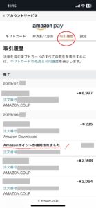 - 出てきた画面(Apazon Pay)の「取引履歴」を選ぶと明細が出てくる