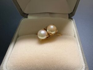 母から譲り受けた2色パールのリングは、サイズ直しもして、リング部分が細いのでパールが浮き立ち大変上品。