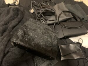 黒いコート、ブラウス、プリーツワンピ(本命)、モヘア上着。カバンも岩佐のものやら小物やら。「黒エプロンは嫁の必需品」と新婚最初の法事で使ったっきり。
