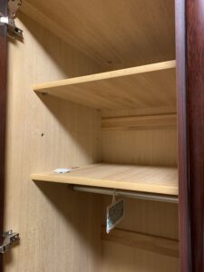 上の段には不祝儀袋、不祝儀袋入れ、白いハンカチ、数珠(家族全員分)、数年前に新たに買った岩佐のバッグ。パールのネックレス・ピアスもここに。白とブラックパールの二種類ありますが、もうネックレスも重い。ブローチとピアスだけで乗り切る方向で、いずれ娘に譲るものとしておいておこ。