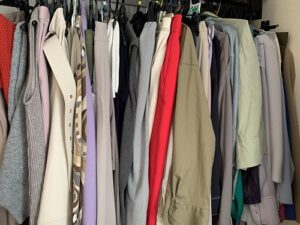 一方、メインの普段着クローゼットがこんなにもカラフルに。カラフル??過去の自分比ではありえない明るい色たちなんですこれでも。赤味・ピンク味はまだ足りないけど、暗くない、黒くない!これ大事。