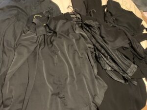 黒いコート、ブラウス、プリーツワンピ(本命)、モヘア上着。カバンも岩佐のものやら小物やら。「黒エプロンは嫁の必需品」と新婚最初の法事で使ったっきり。