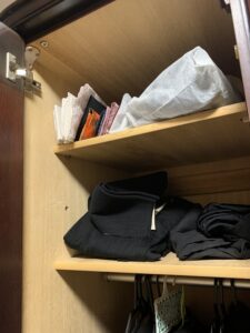 中段には残した黒い衣類。セーター、カーディガン、パンツ(夏・冬用)など。法事くらいならいける。もうここのスペースからは増やさない黒いもの。ストールも大・小・パール入りの3枚。