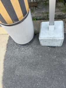 電柱の陰にひっそりバス停のしるし。日傘や傘は必須です。