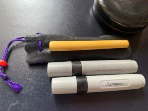 うちにある訂正印は3つ。上の柘植のものは、管理職になった時に作ったもの。下の2つは夫が使っていたシャチハタ印です。もう訂正印を数多く押すことはないだろうから、今回を機に、シャチハタ印は処分して(補充インクもないし)、柘植の分だけを残しておくことにしました。