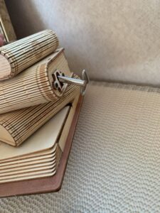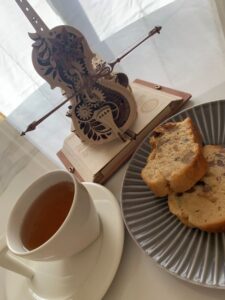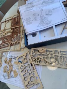 この立体パズルにはオルゴールがついていて、ぜんまいが動いてなんと弓が左右に動きます。おいておくだけでもう素敵。。