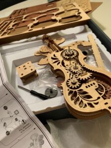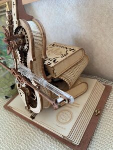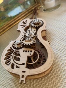 この立体パズルにはオルゴールがついていて、ぜんまいが動いてなんと弓が左右に動きます。おいておくだけでもう素敵。。