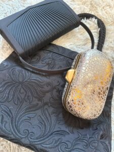 写真下のコード刺繍の黒バッグはブラックフォーマルにも使えそうなものですが買い取りしてもらえて、GOLDのクラッチとぞれぞれ数百円でした。