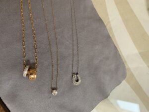 いくつかあるダイヤ+プラチナのネックレス。指輪だピアスだとストレス発散も手伝って爆買いしていたありし会社人の日々。