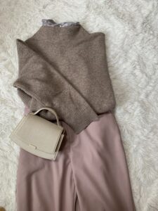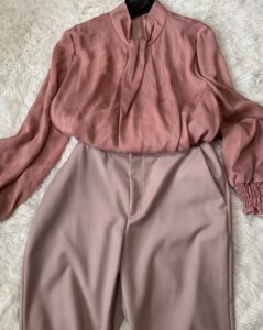 トップスは細かい銀ラメも上品な感じでカジュアルでもいけそう。ピンクのブラウスも素敵。これからも愛用していきます。