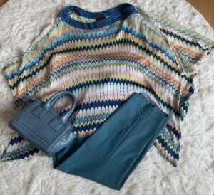 ↓ 候補③ 夏のカラフルバージョン。ミッソーニポンチョ風上着とディノスで買ったパンツとZARAの梅雨の時期どんとこいのバッグ。おそらく空調に耐えられない(腕と首が寒い)のとパンツはお腹いっぱい食べられないことから今回見送り。。。