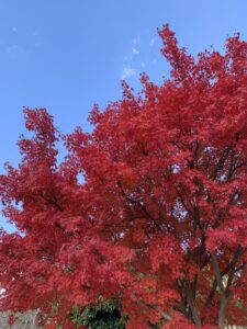 近所の公園の大紅葉(おおもみじ)の木が紅葉(こうよう)していました。お見事、と言いたいほどに。