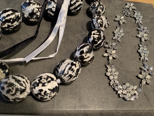 木の実と思われる空洞の軽いものを白と黒でペイントして、白と黒のリボンで1つ通すごとに結び目が作られています。現地で手作業で作られたものなのでしょうね。こんな内職をハワイでやりたいわと妄想しながら結び目をほどいていきます。お好きな長さでチョーカーやブレスレットにリメイク!