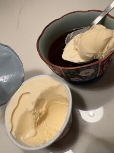 今回は1リットル弱を鍋であたためて、パウダーは3袋使いました。器にいれなくても、タッパーにいれている分だけスプーンですくってアイスとまぜてもいいかも。