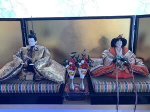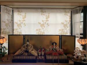 さすがに7段はおくところもしまうところもなく小さめでお願いしましたが、出窓を覆いつくし金箔の屏風がぼんやり光を反射して、なんとも雅です。