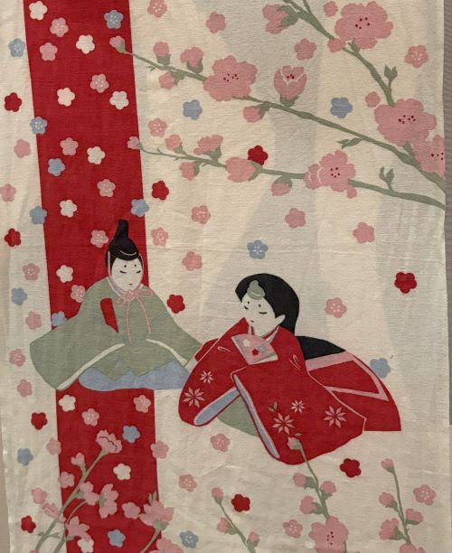 玄関には手ぬぐい。それと私の約60年物。そして義母にいただいた手作り貝のお雛様。