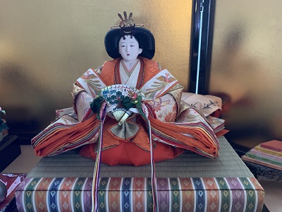 さすがに7段はおくところもしまうところもなく小さめでお願いしましたが、出窓を覆いつくし金箔の屏風がぼんやり光を反射して、なんとも雅です。